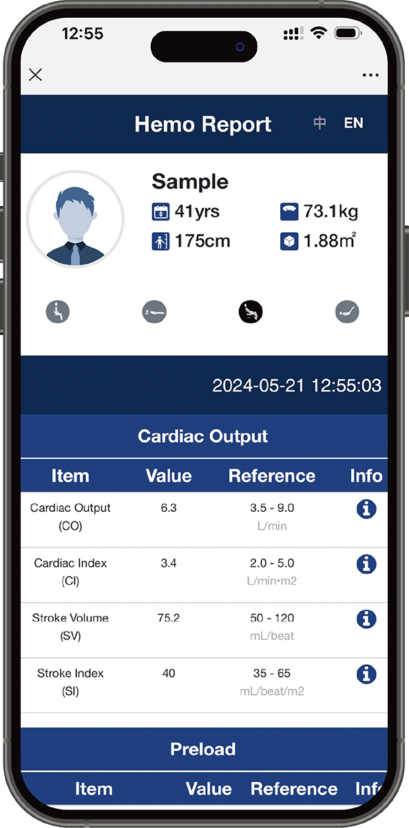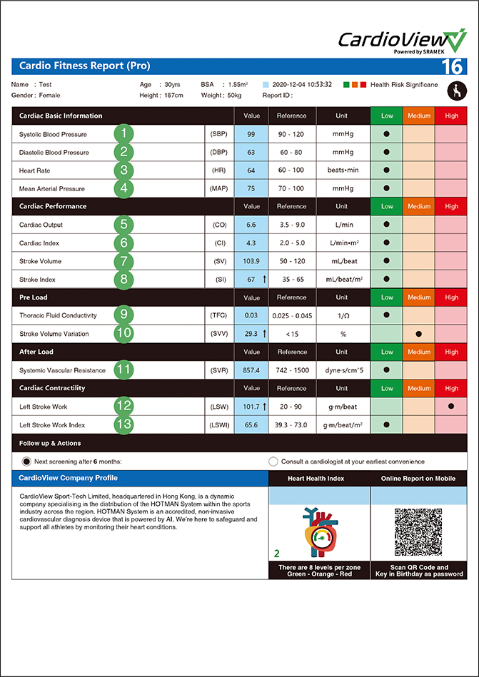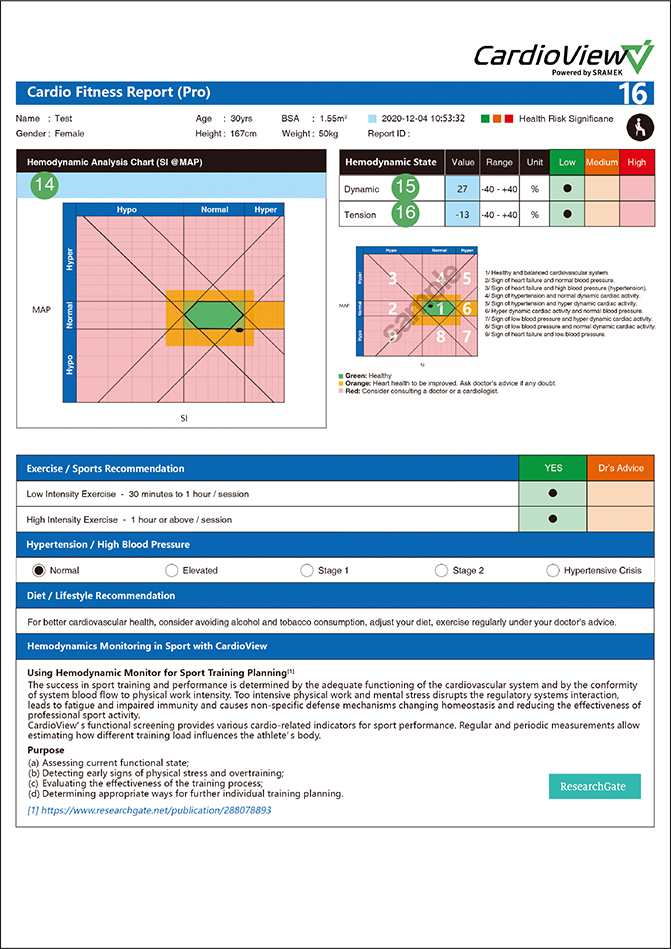 The hexagon indicates the optimal cardiovascular health. The dot represents your hemodynamic balance. When the dot is located inside the hexagon, the high blood pressure risk is minimal.