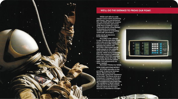 The TEBCO and NCCOM3 technologies have been used by NASA for measuring the heart performance of astronauts in space mission since 1983.